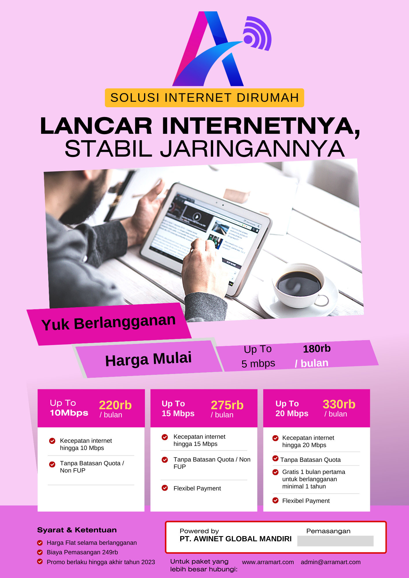 PT. Arramart Sinergi Bangsa adalah perusahaan yang bergerak di bidang Teknologi Informasi, Developer, dan Pengadaan Barang/Jasa. Didirikan dengan fondasi integritas yang kuat, kami menggabungkan keahlian teknis dengan manajemen pengadaan yang efisien untuk melayani kebutuhan klien, mulai dari sektor pendidikan hingga korporasi.